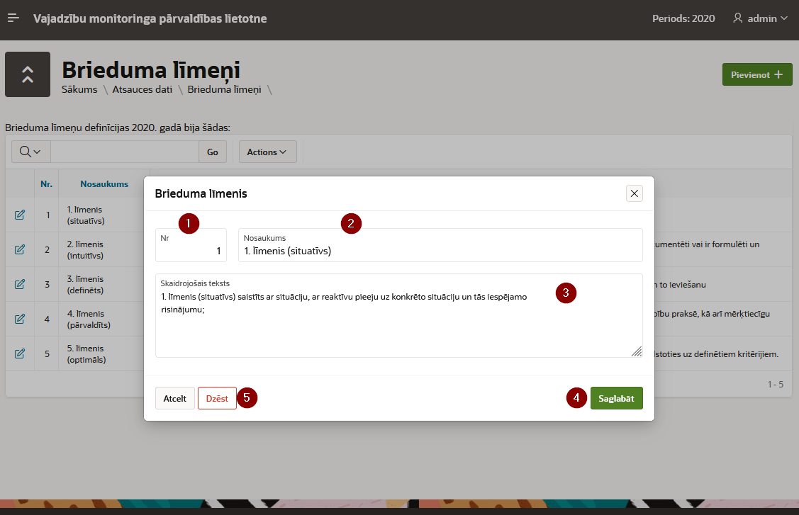 - Numuru. tas tiks izmatots atsaucēm, ielādējot iestāžu brieduma līmeņu datu kopu Iestāžu brieduma līmeņi. Klasifikatorā jābūt visiem līmeņiem uz kuriem atsaucas ielādējamo datu kopā vai arī ielādes process beigsies ar kļūdu.